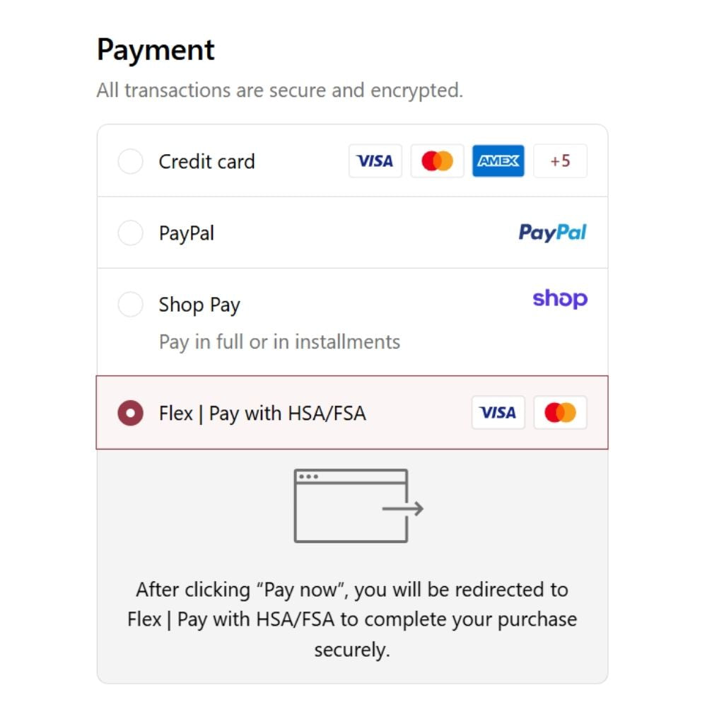 To use your HSA or FSA debit card, add products to your cart as usual. At checkout, make sure you're not signed in to ShopPay and select “Flex | Pay with HSA/FSA” as your payment option.